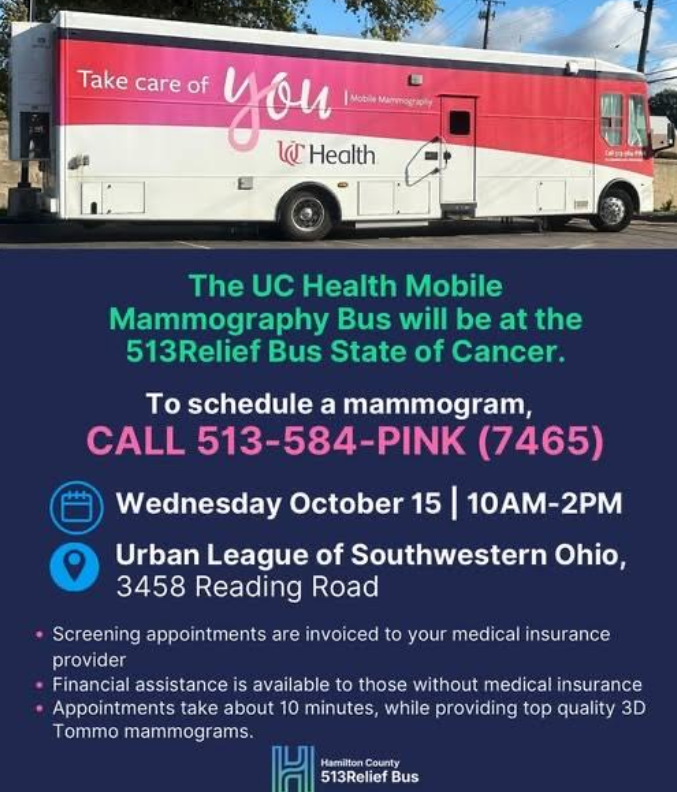 Join us for our Annual Free State of Cancer & Call to action Event and Expo at the Urban League of Greater Southwestern Ohio, 3458 Reading Rd, Cincinnati, OH 45229 starting at 9am with a Pink Reception, State of Cancer in Hamilton County presentation, fireside chat with our health and community leaders, special honors for breast cancer survivors and support groups, and our 513Relief Bus Health Expo with free screenings and critical health and economic resources.